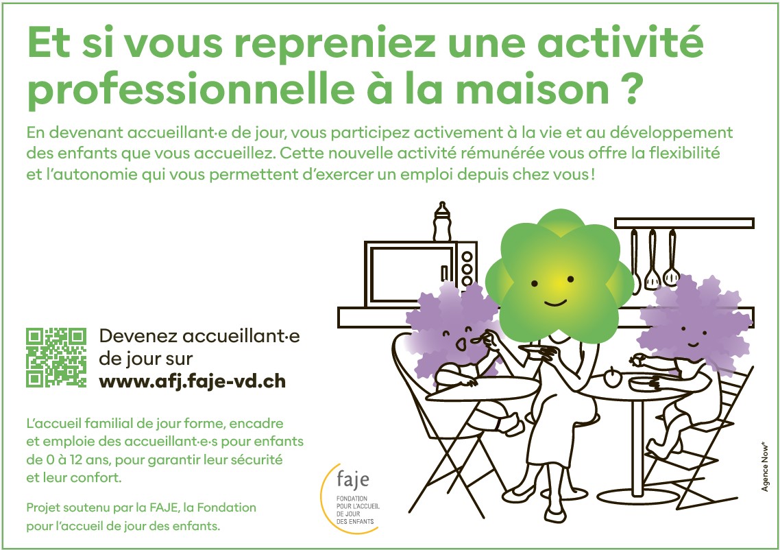 L’accueil familial de jour (AFJ) correspond à la « prise en charge d'enfants par toute personne qui accueille dans son foyer, à la journée (à temps partiel ou à temps plein) et contre rémunération, régulièrement et de manière durable, des enfants » (art. 2, LAJE).